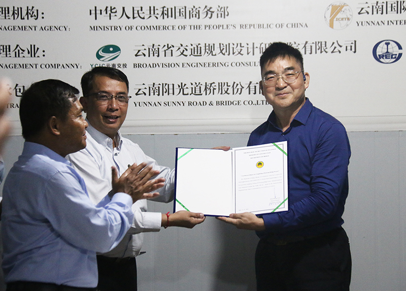 缅甸建设部桥梁司吴觉高秋副总司长向项目管理企业及总承包企业代表颁发了证书,感谢企业在项目建设中付出的辛勤努力,圆满完成了建设任务。