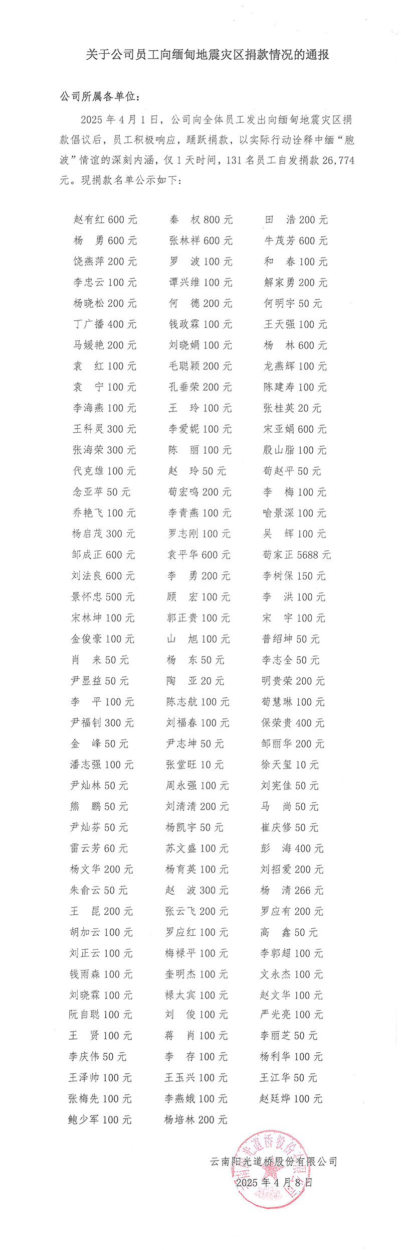 关于公司员工向缅甸地震灾区捐款情况的通报