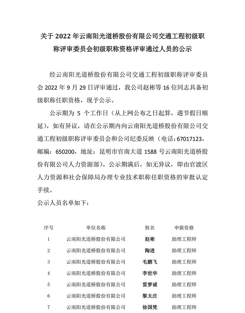 关于2022年云南阳光道桥股份有限公司交通工程初级职称评审委员会初级职称资格评审通过人员的公示