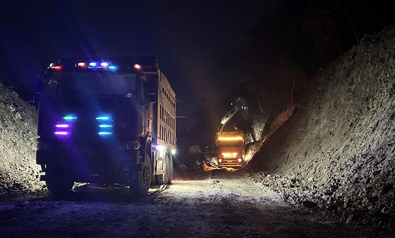 当城市华灯初上,万家灯火时,云南阳光道桥股份有限公司承建的黄勐高速项目TJSG-D标三合同包工地依然是一片热火朝天的景象。为全力冲刺建设目标,项目部吹响了“抢晴天、抓阴天、战雨天,牛毛细雨当好天,月亮底下当白天!”的冲锋号角,开启24小时轮班作业模式。